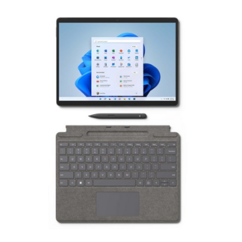 마이크로소프트 Surface Pro 8에는 플래티넘 타입커버와 슬림펜2가 함께 제공됩니다. 이 타입커버는 키보드와 트랙패드를 갖추고 있어 노트북으로 사용할 수 있으며, 플립되어 타블렛 형태로 사용할 수도 있습니다. 또한, 타입커버는 Surface Pro 8과 완벽하게 호환됩니다.