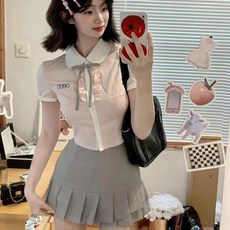 세트교복 여름 달콤한 학원풍 핑크 셔츠 그레이 플리츠 스커트 JK 유니폼 스커트 투피스 여